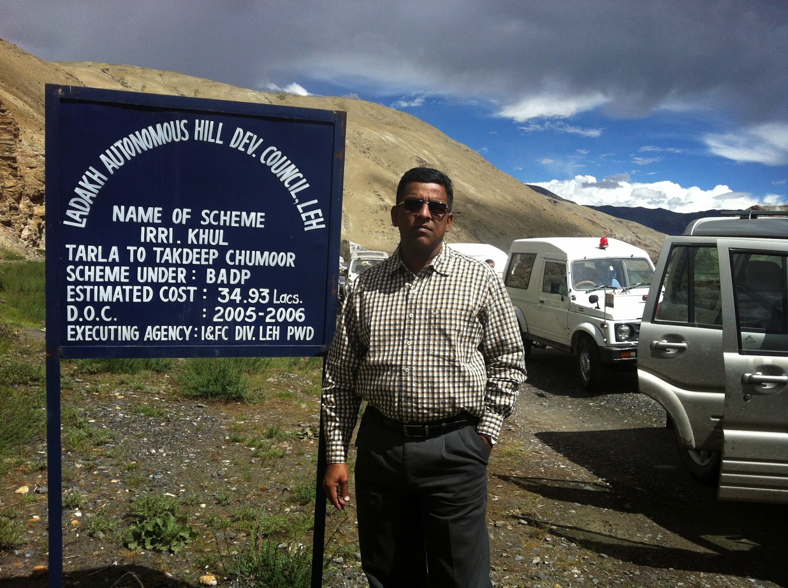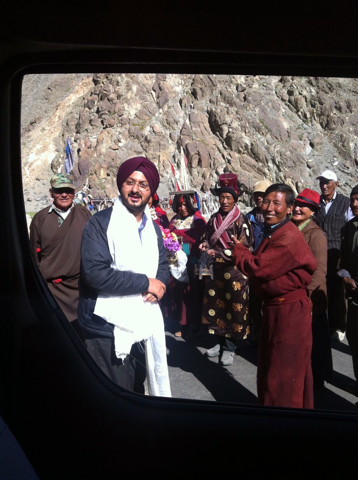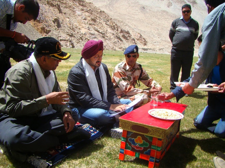 from Shyok, which is slightly off the main road, stop the Collector’s car. The young collector, decides to hold an impromptu roadside meeting. The villagers have come prepared with a flat, low table, carpets to sit on, tea and snacks for the collector’s party. After all, not every day does the collector come visiting. After the traditional welcome, the whole party from Leh squats on the grass as villagers pour out their woes. They have a whole list of demands for their tiny village; an irrigation facility left incomplete, a road in a state of disrepair. Very basic demands but important nevertheless. Simrandeep gives them a patient hearing, asks his assistant for details of projects earmarked for Shyok and assures action on doable points. Quite apart from the instant decision making, it is refreshing to see absence of an intrusive security around the collector. The villagers are speaking to him one to one and without any fear. Its educative to see grassroots administrator in action!