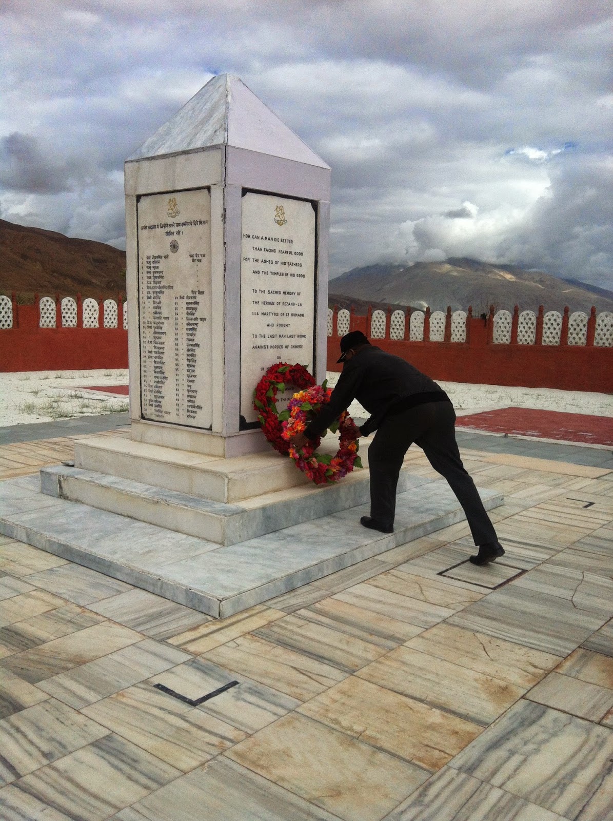 Day II, 29 July: Departure 6.45 am. Breakfast at the ITBP camp in Chushul. Astonished to learn that this post has been located here since 1963. Even now, Chushul is back of the beyond. Even now, this fairly largish village has ONE telephone that is shared between villagers, ITBP and the Army. I am left wondering what would it have been five decades ago! Nothing has changed since my last visit here in 2007 when I had stayed at this location (at 14450 feet) for two days. The road in and out of the village and Army battalion HQ is as dusty as before; electricity is non-existent; there is one weekly bus service to Leh, the district capital! We are headed to Tasga La village (see map) as a first stop. But there is duty to be done: pay our respects at the Rezang La War Memorial built in memory of the 113 brave hearts of the 13 Kumaon Battalion who fought to the last man, last bullet and died in the line of duty in the summer of 1962, facing Chinese human waves. The memory of Maj Shaitan Singh, Param Vir Chakra and his 112 ferocious Ahirs lives on at this desolate spot. Tears automatically well up as I lay a wreath at this starkly simple monument, barely a dot in the vast Ladakh flat land.