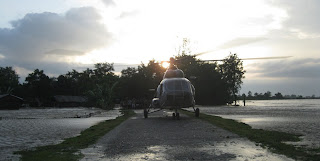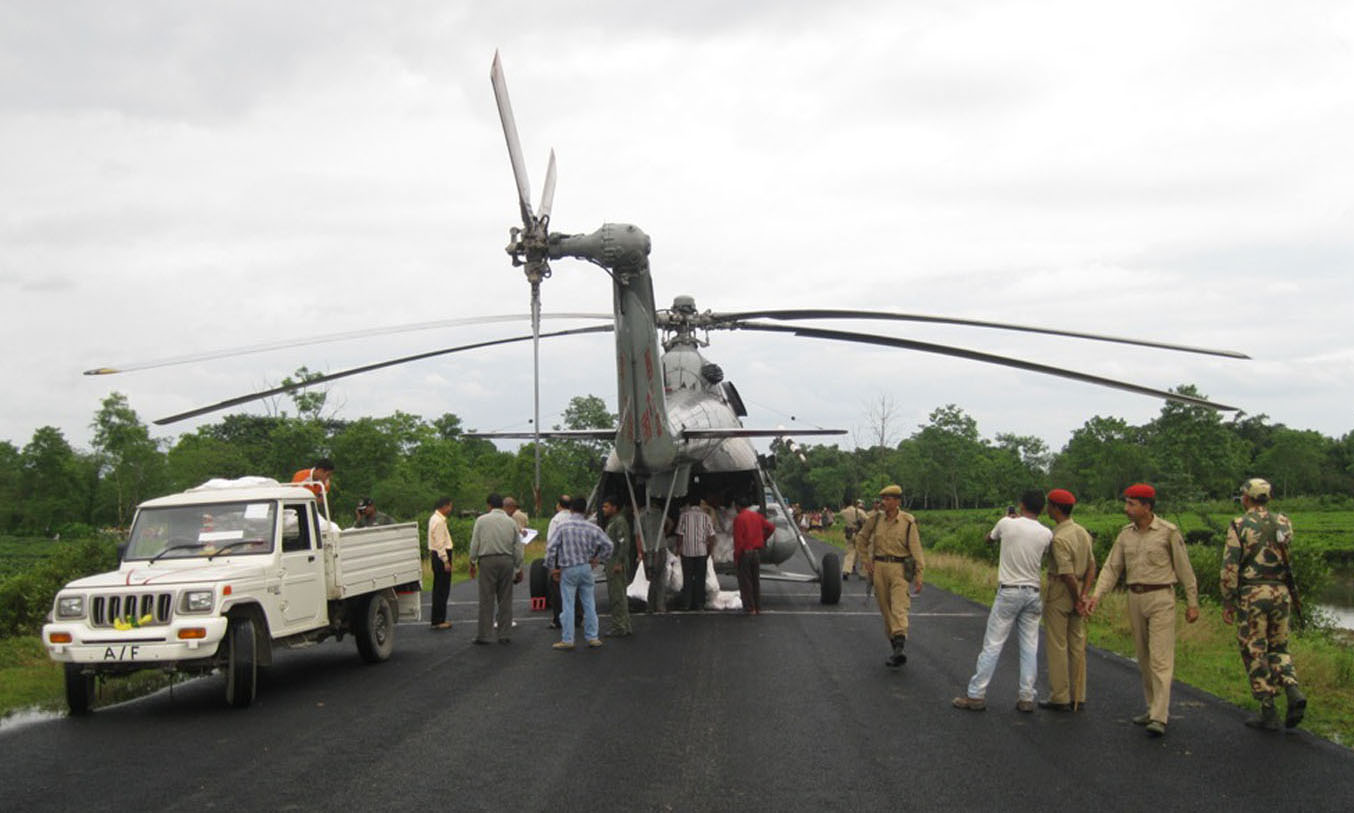 A Mi-17 helicopter from the ‘Siachen Tigers’ unit got airborne from Mohanbari and landed on a makeshift helipad which was made by marking ‘H’ on the national highway by-pass of Tinsukia town road after blocking the road from both sides as excessive rain throughout the past week had caused flooding of the regularly used helipad.