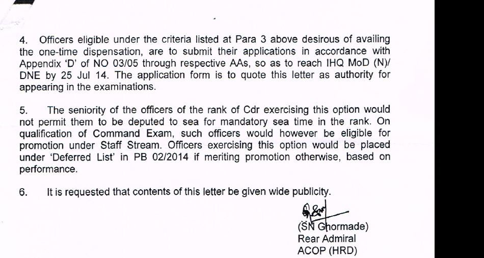 The one-time exception, issued by the Naval HQ last month (see document), also gives officers who have not qualified for the key ‘command examination’ another chance to appear and qualify for the rank of captain.