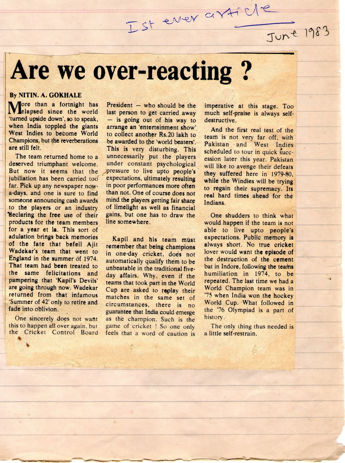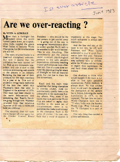 Then on June 25th, Kapil Dev’s unheralded team won the Prudential Cricket World Cup. We didn’t have a TV at home but being on the sports desk, I had the privilege of watching the match in the office.The whole nation erupted in joy. As the triumphant team returned home, the euphoria showed no signs of abating even a month later. The paper were full of articles, analysis and photographs of Kapil’s Devils.